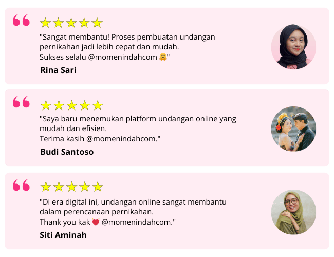 Pilih undangan digital dari Momen Indah karena kami menawarkan desain elegan, kustomisasi mudah, dan pembuatan yang cepat selesai. Dengan lebih dari 450+ pilihan tema, kami siap memenuhi kebutuhan spesialmu 😍